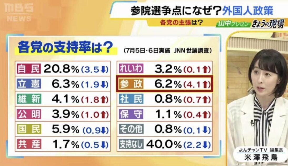 JNNが7月5日・6日行った世論調査では、政党支持率で、自民20.8%、立憲6.3%に続いて参政6.2%が、国民民主5.9%を上回り3位に浮上しています。(以降、維新、公明、れいわ、共産…の順)。また参議院選挙の比例代表の投票先を問う調査でも、参政党は5月時点の2%(9位)から9%(3位)と7ポイント伸ばすなど、別のデータにも表れています。