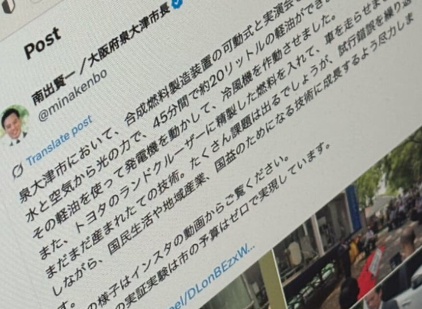 「何か騙されてないか?」 大阪・泉大津市長の“夢の燃料”X投稿に疑問を呈する声が相次ぐ 市の見解は? 大阪府泉大津市の南出賢一市長によるSNS投稿が、XやInstagram内で波紋を広げている。