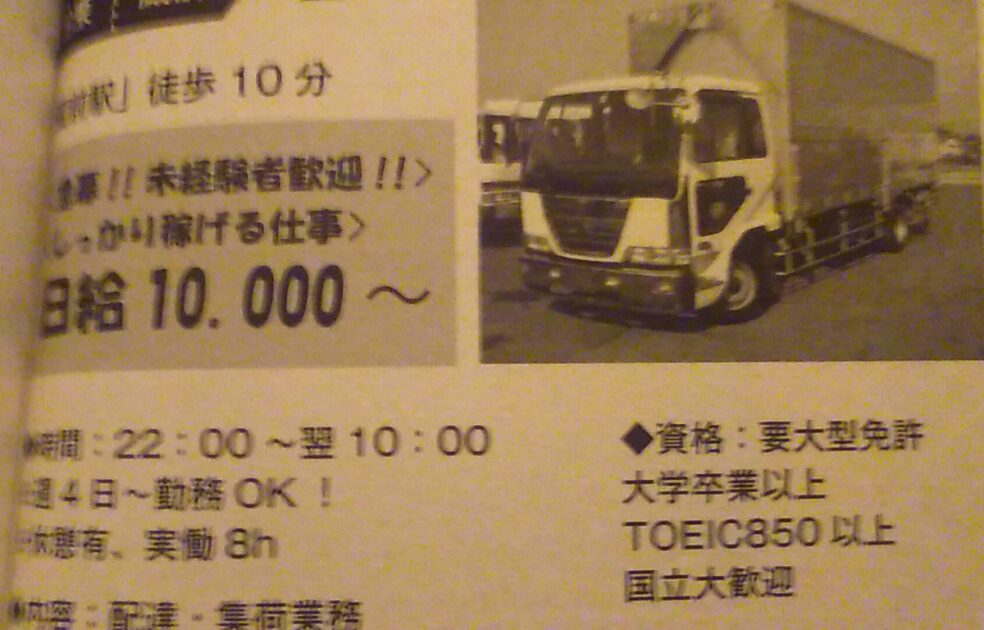 氷河期時分に見られた求人票職種:トラック運転手10t含む