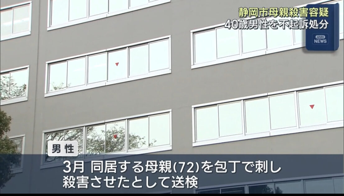 母親を殺害したとして送検された40歳の男性について、静岡地検は11日付で不起訴処分としました。 不起訴処分となった静岡市駿河区に住む40歳の無職の男性は、3月自宅で当時72歳の母親の背中を包丁で刺し、殺害したとして送検されていました。