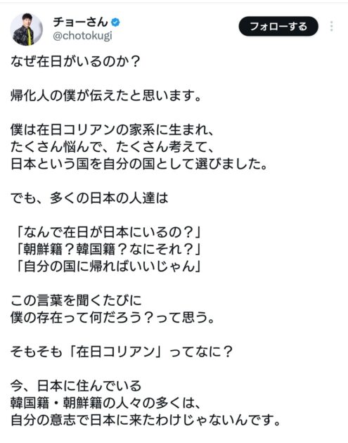 引用元: ・【悲報】 在日コリアン 「日本に住んでいる在日の多くは、自分の意志で日本に来たわけじゃない」 [593349633]