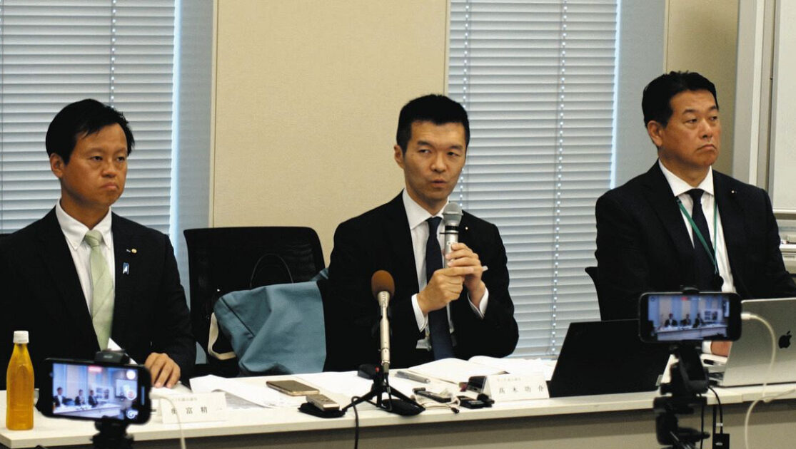 クルド人らが経営するヤード視察での「トラブル」を巡り、1日に行われた議員らの記者会見。視察を主催した高木功介埼玉県議が「民主主義に対する冒瀆(ぼうとく)だ」と訴えた。奥富精一川口市議、諸井真英県議も同席した。