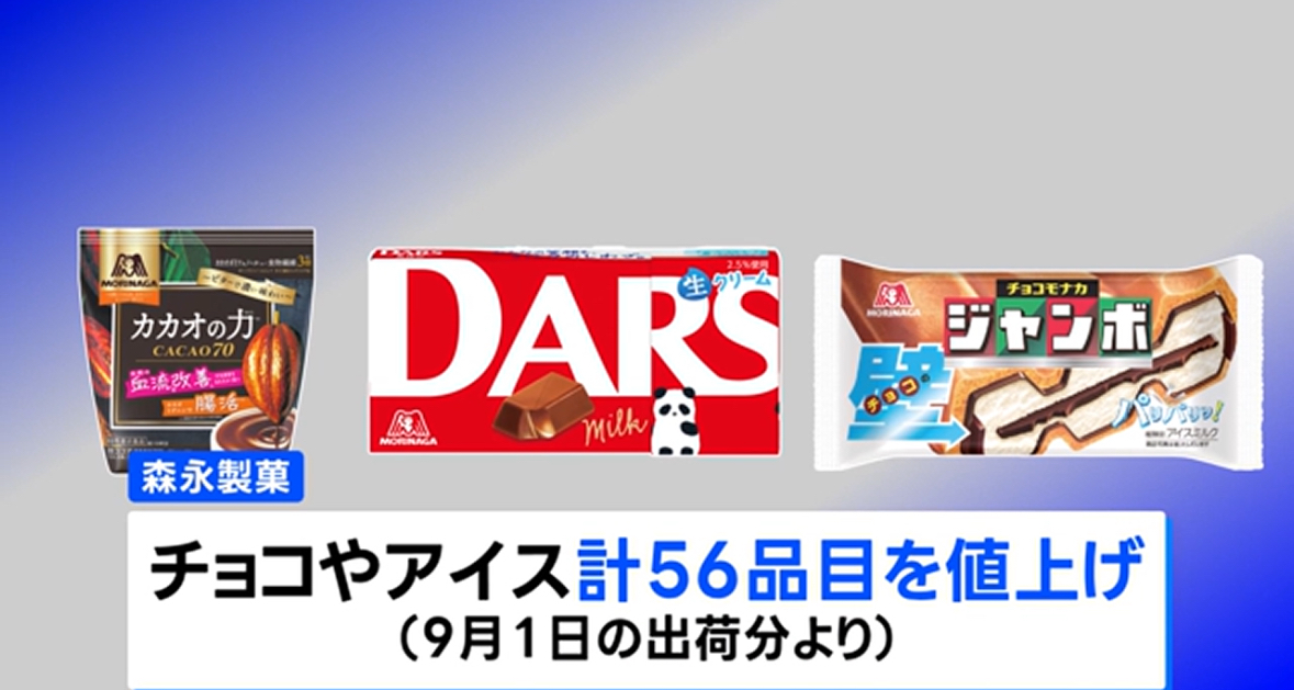 「ダース」や「チョコモナカジャンボ」などが9月から順次、値上げされます。一部の商品の値上げは今年に入って2回目です。森永製菓は9月1日の出荷分より順次、チョコレート菓子やアイスなどあわせて56品目を値上げすると発表しました。値上げ幅は最大およそ21%で、56品目のうち2品目については容量も減らすということです。