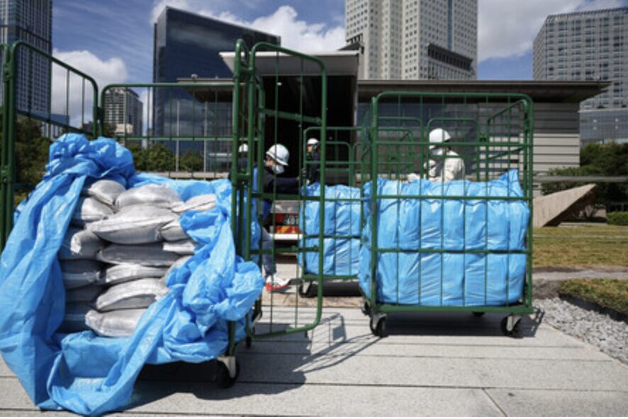 首相官邸に運びこまれた除染土が入った袋=2025年7月19日、東京都千代田区