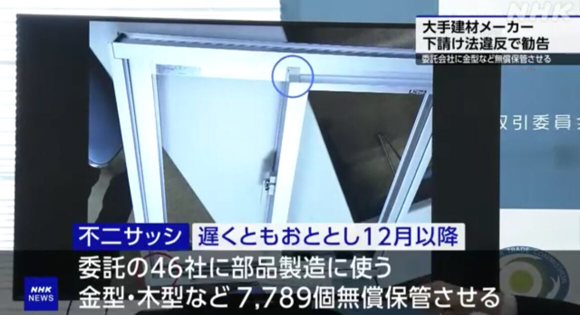 大手建材メーカーの「不二サッシ」が、アルミサッシの部品の製造を委託していた40余りの会社に製造に使う金型を無償で保管させていたほか、一部では品質検査を行わずに返品するなど下請け法に違反したとして、公正取引委員会は再発防止を求める勧告を出しました。