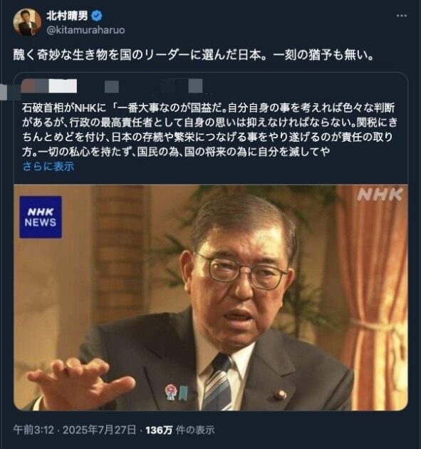 北村氏はこれまでも複数回にわたり、石破首相について言及する投稿で「奇妙な生き物」という言葉を使用している。
