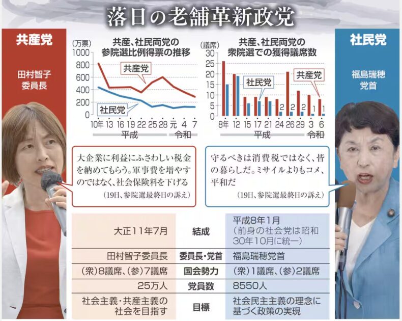 https://www.sankei.com/article/20250727-GUF6TWAVKJM7LK3WKGRMRIIU6I/20日投開票の参院選では参政党の躍進が注目された一方、社民党、共産党という老舗の革新系政党の落日が鮮明となった。両党の苦境は支持者の高齢化に加え、特定の政治思想の実現を目指すイデオロギー政党が「時代遅れ」になったことが原因とも指摘される。
