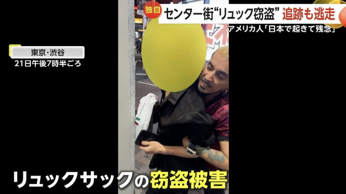 2025年7月28日 月曜 午後0:30東京・渋谷区のセンター街で21日、撮影中のアメリカ人カメラマンが置いていたリュックが盗まれた。その後、アメリカ人男性はAirTagで位置情報を追跡し、約30m先の路地でリュックを漁る男性と遭遇し、取り押さえた。