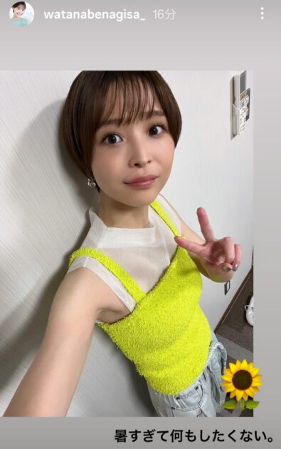 インスタグラムのストーリーズに「暑すぎて何もしたくない」と記し、自撮りショットを投稿した。透け素材のタンクトップに、イエローのキャミソールを合わせたカジュアルコーデ。脇をチラ見せし、日焼けした肌が夏っぽい。