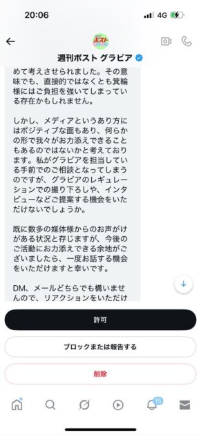 そして29日、箕輪氏は「週刊ポスト グラビア」と名乗るアカウントからの文面を公開。その文面には、グラビアやインタビューのオファーが書き連ねてあった。箕輪氏は文面を公開した上で「週刊誌全員死ねよハイエナ」とバッサリ切り捨てた。