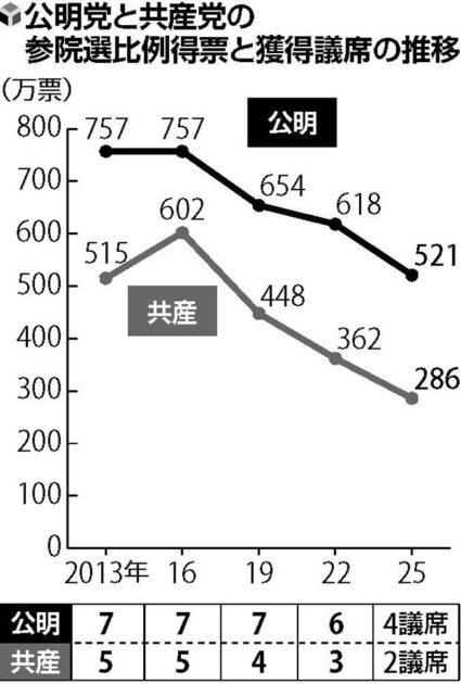老舗政党である公明党と共産党が苦境に立たされている。参院選ではいずれも得票が伸びず、惨敗した。強固な組織票を誇ってきたが、支持層の高齢化で活動量が低下し、新興政党の勢いに押されて党勢は右肩下がりにある。(田ノ上達也、田村直広)