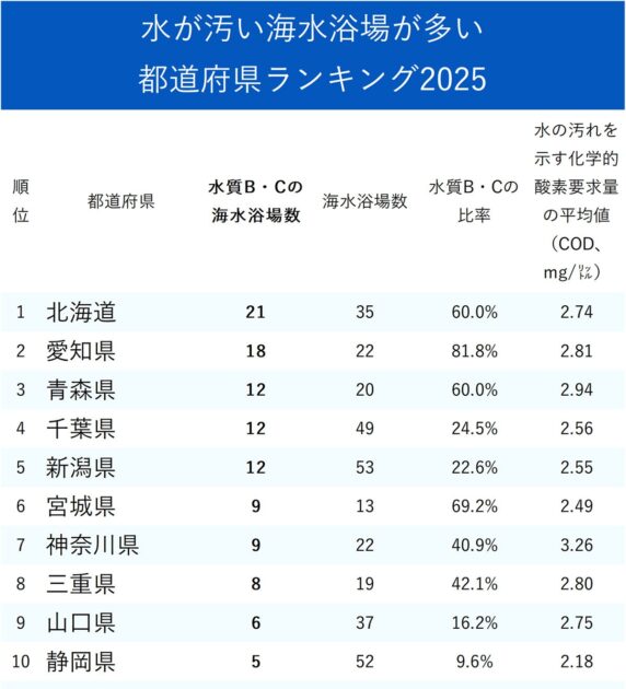 引用元: ・水が汚い海水浴場が多い都道府県ランキング2025、3位青森、2位愛知、意外な1位は北海道! [837857943]