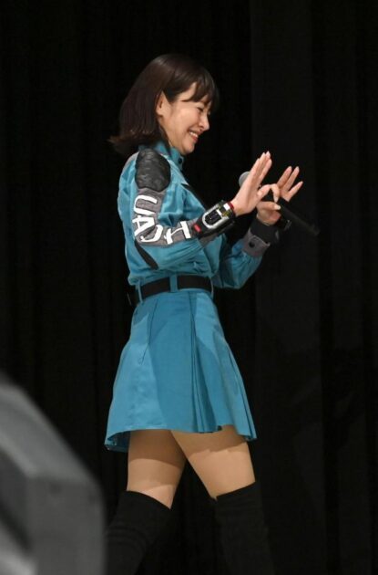 1995年3月から96年2月までテレビ朝日系で放送された特撮ドラマ。煙の中から30年前のオーレンジャーコスチューム姿で登場したさとうは、変身ポーズを決め「はい!丸尾桃役のさとう珠緒です!」とあいさつ。満席の会場から「桃さ~ん」と大声援が飛んだ。