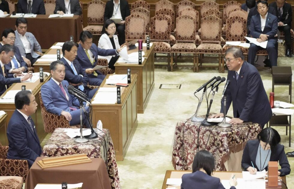 石破茂首相は4日、参院選後初の国会論戦となる衆院予算委員会に臨んだ。参院選の物価高対策で争点となった消費税減税や現金給付に関し、財源を含め立憲民主党と協議する意向を示した。立民の野田佳彦代表の質問に対し「選挙で支持をいただいた比較第1党と第2党が責任を共有したい」と強調した。続投期限については、日米関税合意で事業者が不利益を受けないかどうかを見る必要があるとして「今、断定できない」と述べた。 参院選公約で自民は現金給付を掲げる一方、立民は消費税減税とともに実現までは給付で対応する方針を訴えていた。野田氏は予算委で「給付金、減税の可能性、給付付き税額控除について真摯に協議をさせてほしい」と呼びかけ、首相は「その通りにしたい」と応じた。衆院に続き参院でも少数与党となったことで、野党との協調路線をより鮮明にした形だ。