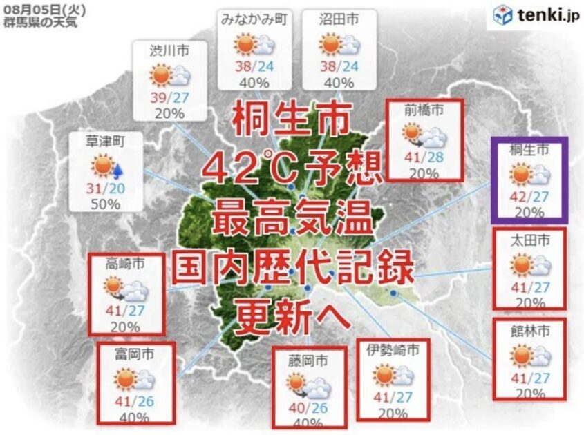 明日5日の予想最高気温は、群馬県桐生市で42℃の予想です。他にも群馬県前橋市・館林市・高崎市・伊勢崎市、埼玉県本庄市・鳩山町、栃木県佐野市・足利市、茨城県筑西市などで41℃です。これまでの国内の歴代最高気温は今年7月30日に兵庫県丹波市(柏原)で観測した41.2℃ですが、これを複数地点で上回る可能性があります。関東ではほかにも、群馬県藤岡市、埼玉県熊谷市・秩父市・久喜市・川越市・所沢市、栃木県小山市、茨城県古河市・笠間市、東京都八王子市・立川市など40℃予想です。これまでの1日に40℃以上の地点の最多は2022年7月1日と2024年7月29日の6地点でしたが、それを関東地方だけで大幅に上回る可能性もあります。(tenki.jp17時予報より)