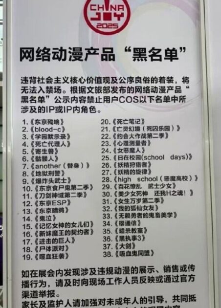 そのリストには、「社会主義の核心的価値観および公序良俗に反する服装は入場禁止」と明記され、「DEATH NOTE」や「進撃の巨人」、「寄生獣」、「School Days」、「東京喰種トーキョーグール」、「暗殺教室」、「黑執事」、「かのこん」、「学園黙示録 HIGHSCHOOL OF THE DEAD」、「ソードアート・オンライン」、「デビルメイクライ」など、多数の人気アニメ作品のキャラクターのコスプレが禁止されていた。