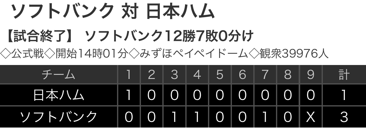 日本ハム 1 0 0 0 0 0 0 0 0|1