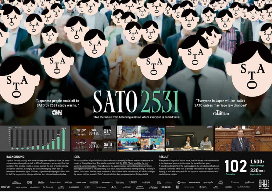 2025年、世界の広告賞で評価された「#2531佐藤さん問題」。一般社団法人「あすには」が提起する、選択的夫婦別姓の問題を“未来に苗字が絶滅する”という視点で捉え直した企画だ。