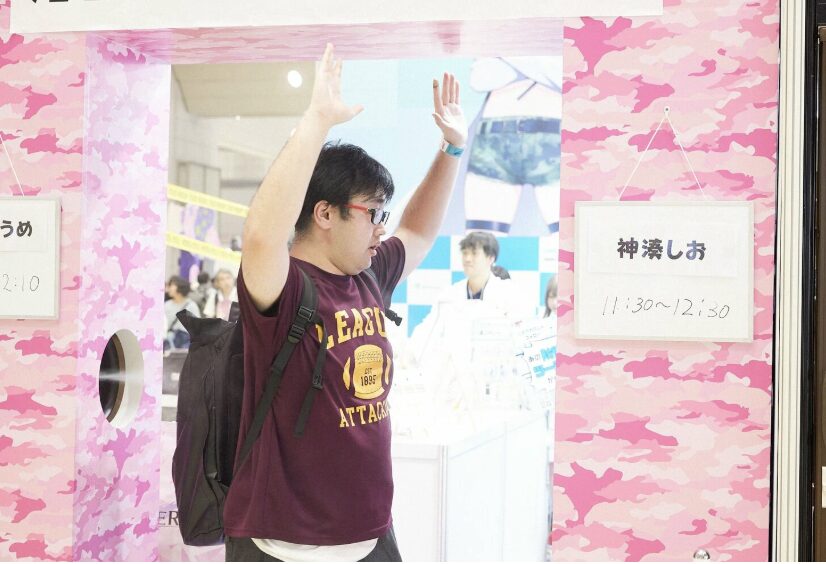 そんな激臭問題に今年も正面から取り組んだのが、株式会社ワカヤマだ。ブースの入り口に「消臭ゲート」を設置。ゲートを通過すると消臭スプレーが噴射され、中で待機しているコスプレイヤーと写真撮影できるというシステムだ。