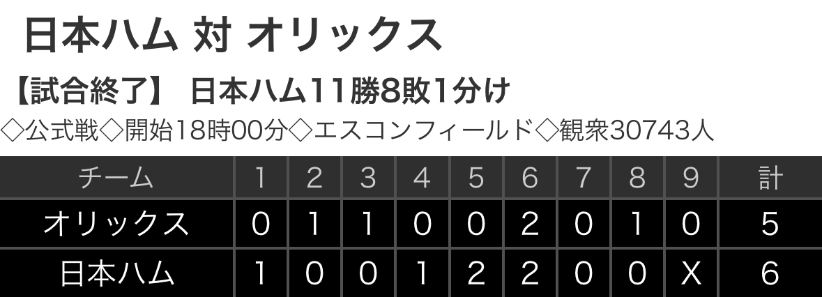 日本ハム   1 0 0  1 2 2  0 0 x|6