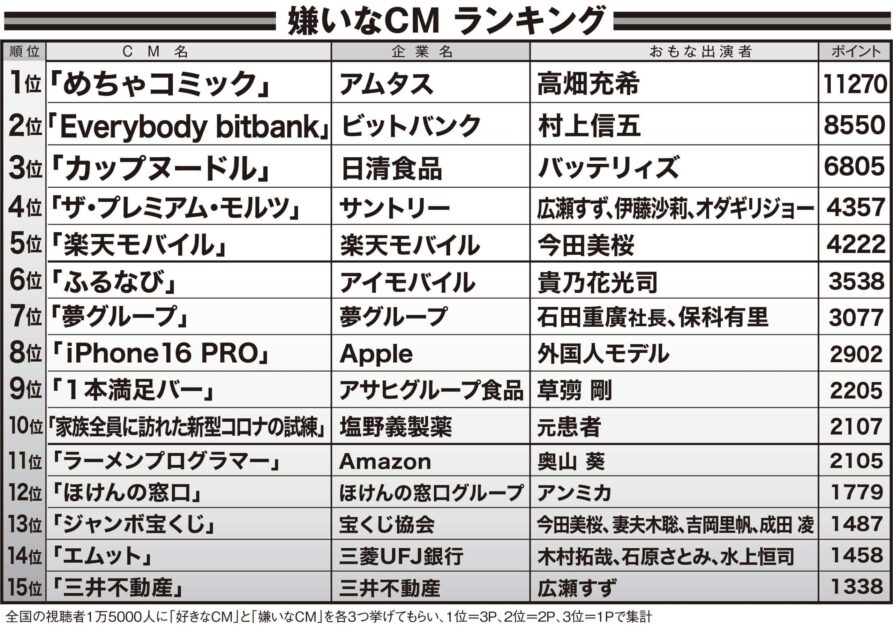時代を映すCMーー2025年の国民の声は?では「嫌いなCM」を見ていこう。1位は、高畑充希(33)が出演する「めちゃコミック」。