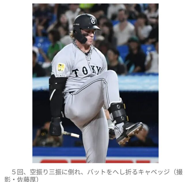 巨人のトレイ・キャベッジ外野手のフラストレーションが爆発。空振り三振に倒れた直後、バットをへし折り、球場は騒然となった。