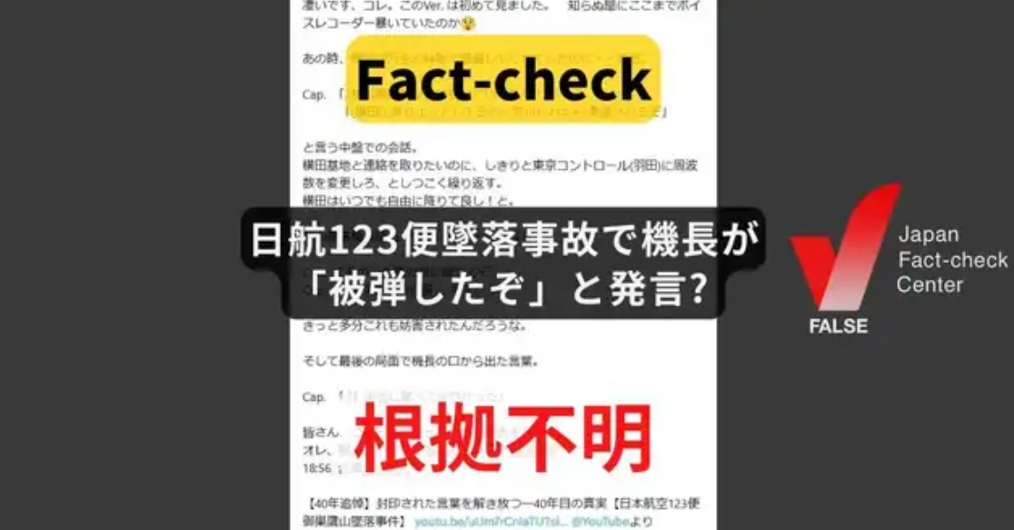 【ファクトチェック】日航123便墜落事故で機長が「あっ!被弾したぞ!本当に撃ちやがった!」と発言?…記録も音声も根拠もなし