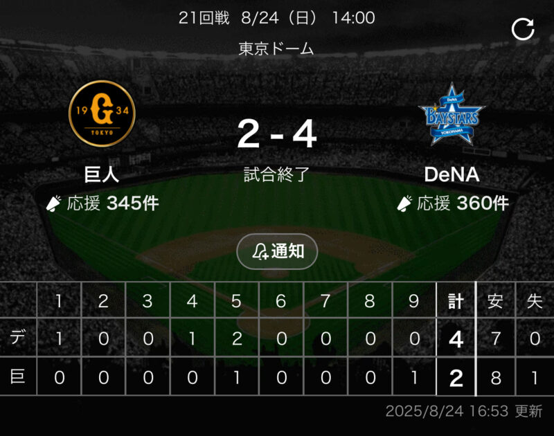 【野球】セ・リーグ G 2-4 DB [8/24] DeNA連敗脱出 ドラ1竹田6回1失点2勝目、宮﨑先制打&6号2ラン、筒香8号HR 巨人連勝ストップ