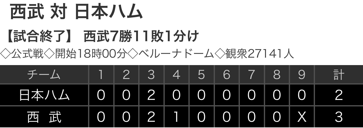 引用元: ・【設備不良】パ・リーグ L 3-2 F [8/27] 西武・與座6回途中2失点、渡部同点2ラン、長谷川勝ち越しタイムリー 日本ハム接戦を落とす [鉄チーズ烏★]