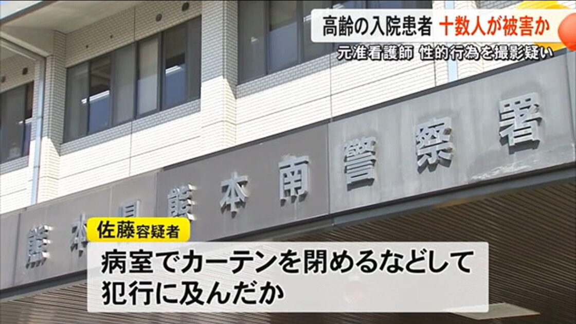 熊本市内の病院で、入院患者の高齢女性に性的暴◯を加え、その様子を撮影するなどした疑いで元准看護師の男が逮捕された事件の続報です。その後の捜査で、男のスマートフォンから別の入院患者に性的な行為をする動画や画像が見つかり、被害者が十数人にのぼるとみられることが捜査関係者への取材で分かりました。この事件は、熊本市西区の病院で当時、准看護師として働いていた北区清水亀井町の佐藤 勝則 容疑者(28)が、今年1月から2月にかけていずれも入院患者の90代の女性に自分の下腹部を露出し触らせようとした疑いと、80代の女性に性的暴◯を加え、その様子をスマートフォンで撮影した疑いでこれまでに2度、逮捕されているものです。