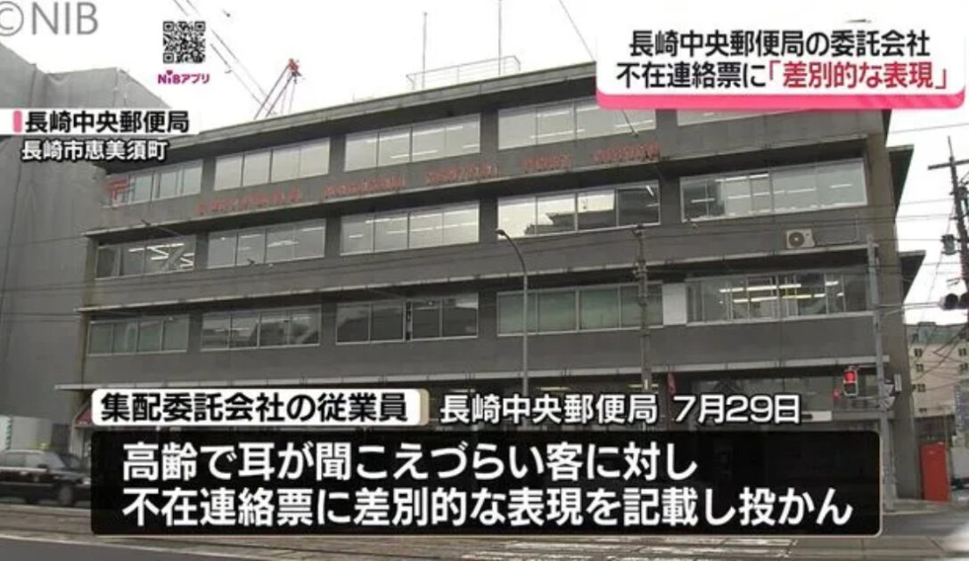 日本郵便によりますと、先月29日、長崎中央郵便局の集配委託会社の従業員が、高齢で耳が聞こえづらい客に対し、不在連絡票に差別的な表現を手書きで記載し、郵便受けに投かんしたということです。
