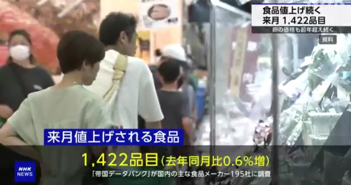 原材料価格の高騰などを背景に9月、値上げされる食品は去年の同じ月より0.6%多い1422品目に上ることが分かりました。