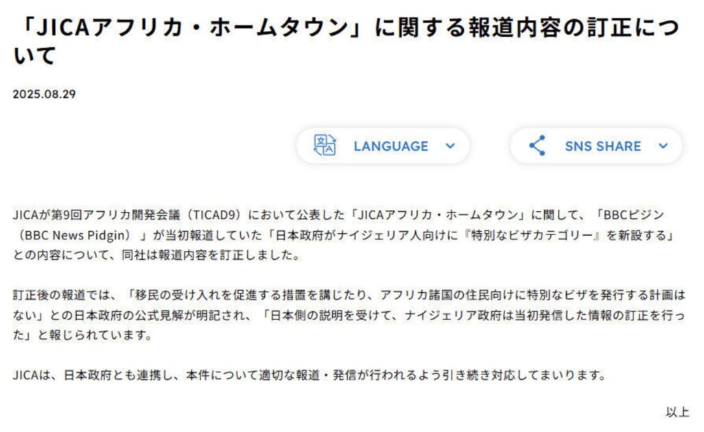 JICAはこのほど「JICAが第9回アフリカ開発会議(TICAD9)において公表した『JICAアフリカ・ホームタウン』に関して、「BBCピジン(BBC News Pidgin)」が当初報道していた『日本政府がナイジェリア人向けに『特別なビザカテゴリー』を新設する』との内容について、同社は報道内容を訂正しました」と告知。「訂正後の報道では、『移民の受け入れを促進する措置を講じたり、アフリカ諸国の住民向けに特別なビザを発行する計画はない』との日本政府の公式見解が明記され、『日本側の説明を受けて、ナイジェリア政府は当初発信した情報の訂正を行った』と報じられています」と伝えた。