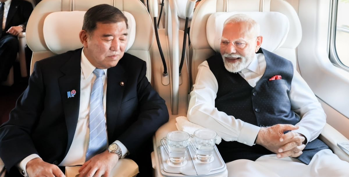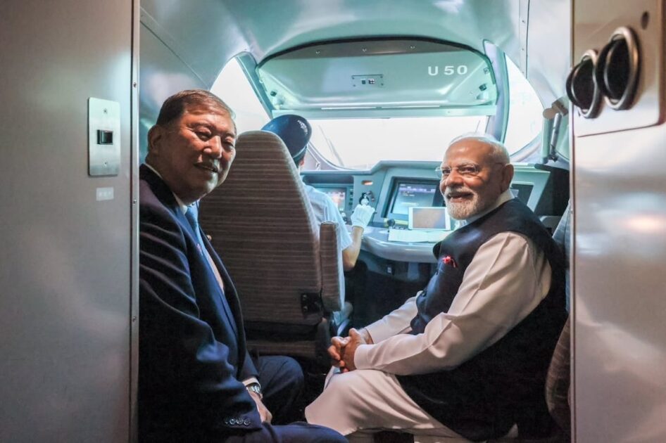 石破首相㊧とモディ首相が東北新幹線に乗車した(30日)=内閣広報室提供