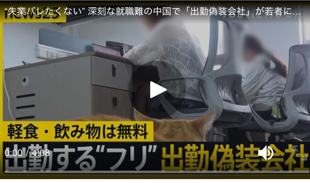 “失業バレたくない” 深刻な就職難の中国で「出勤偽装会社」が若者に人気 働き方のイマ”に注目する「work23」です。机にパソコン、社長室も揃ったオフィスですが、実は「作りモノ」。失業した人が“出勤するフリ”をするための「出勤偽装会社」がいま、中国で注目を集めています。