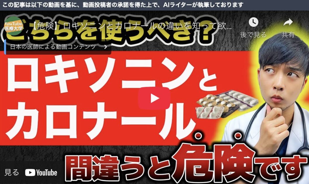 AIライター自動執筆記事YouTubeチャンネル「YouTube医療大学」が公開した動画で、総合診療専門医の舛森医師が、多くの人が一度は手にしたことがある痛み止め「ロキソニン」と「カロナール」の違いや危険な使い方について警鐘を鳴らしている。