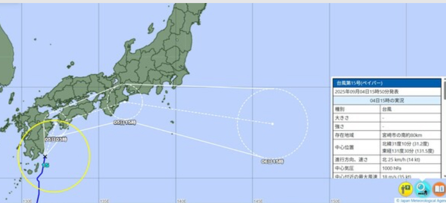 台風15号が9月4日午後4時、宮崎市の南南東の海上を北上。今後、東へ進んで関東甲信地方に接近する恐れがあり、東京地方と伊豆諸島では警報級の大雨になる可能性がある。続き
