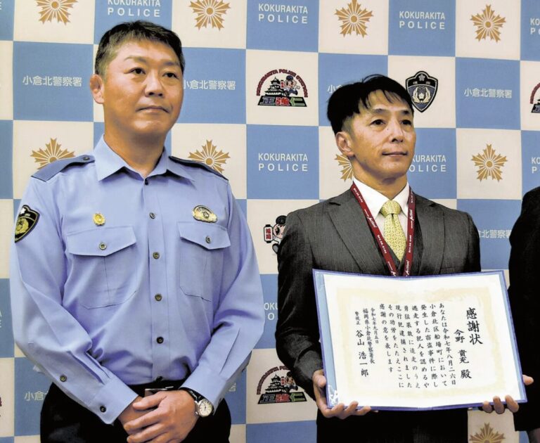 同署によると、事件は8月26日に発生。同市小倉北区の百貨店「小倉井筒屋」のブランド品店で、50歳代の男がショルダーバッグ2点(販売額計84万7000円)を盗んで逃げたところ、店にいた今野さんが約200メートル離れた歩道で取り押さえ、駆けつけた警察官に引き渡した。