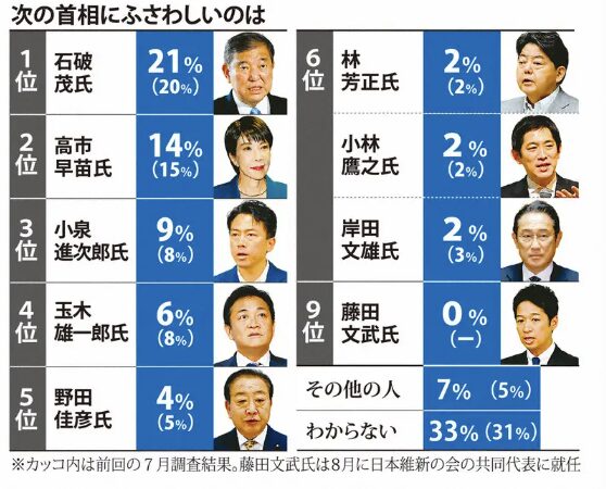 「次の首相」石破氏1位、高市氏2位変わらず 参政神谷氏らの名前も | 毎日新聞 ★2 [少考さん★]