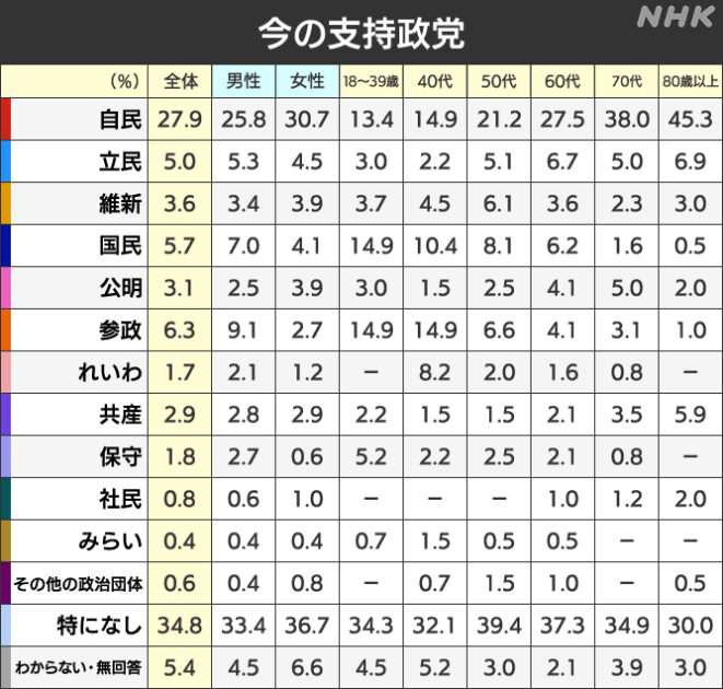 引用元: ・政党支持率 自民27.9% 参政6.3% 国民5.7% 立民5.0% | NHK [少考さん★]
