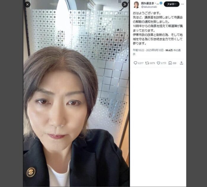 10日のX投稿では、「先ほど、議長室を訪問しまして市議会の解散の通知を致しました」として、自撮り写真を添え議会の解散を選択したことを報告した。