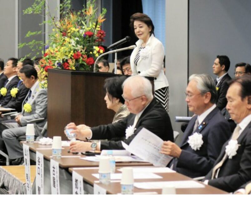 「お祝いの言葉」として、主催者が「悠久の伝統を踏まえ、一刻も早く必要な法整備を」と読み上げた後、出席者は「天皇陛下万歳」を三唱。最後に主催者を代表して、超党派の「日本会議国会議員懇談会」会長、古屋圭司衆院議員があいさつに立ち、「日本の天皇家の悠久の歴史を守り切る。万系一世、男系男子の伝統を守ることが大きな責任です」と語った。