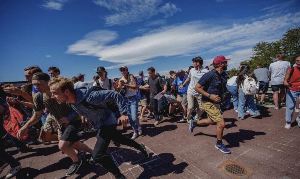 10日、米西部ユタ州オレムのユタバレー大でチャーリー・カーク氏が撃たれ、逃げ惑う人々(ロイター=共同)