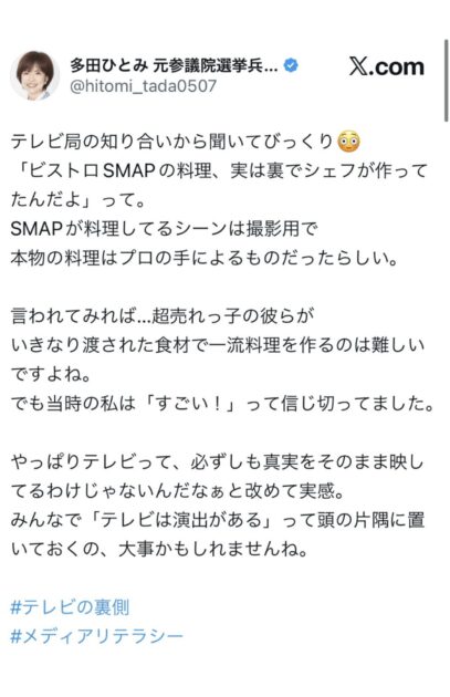 「テレビ局の知り合いから聞いてびっくり『ビストロSMAPの料理、実は裏でシェフが作ってんだよ』って。SMAPが料理してるのは撮影用で本物の料理はプロの手によるものだったらしい。言われてみれば…超売れっ子の彼らがいきなり渡された食材で一流料理を作るのは難しいですよね」(原文ママ)と、テレビには演出があるという点を伝えたかったようだ。