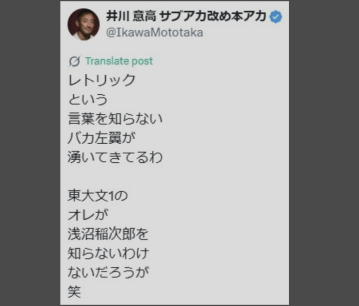 しかし井川氏は12日深夜のポストで、これに対し「レトリックという言葉を知らない バカ左翼が湧いてきてるわ 東大文1のオレが 浅沼稲次郎を知らないわけないだろうが 笑」と切り返した。(略)
