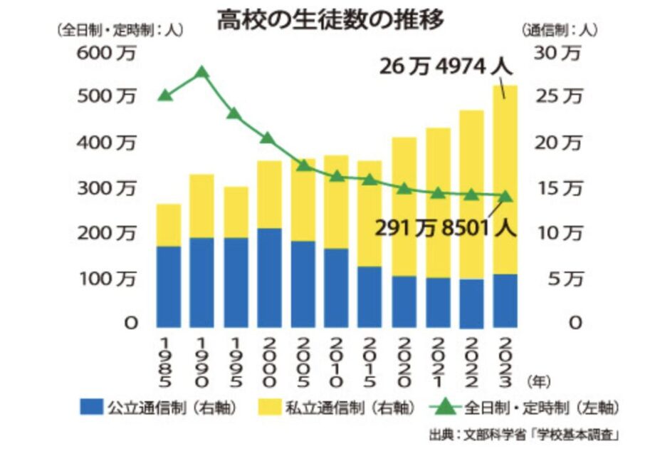 速報値によると、5月1日現在の通信制高校の生徒数は30万5221人で、女子が男子よりも多い。24年度と比べると、1万5134人(5・2%)増えた。全日制が4万2433人減ったのと対照的だ。