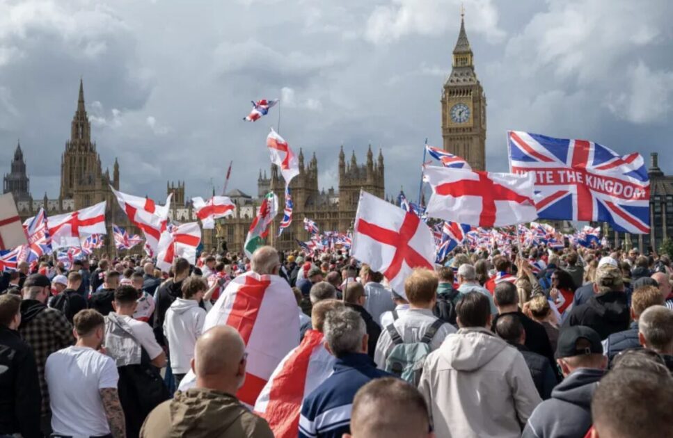 英国では難民申請者をホテルで受け入れる政策に国民の不満が高まり、デモが頻発。13日は極右に強い影響力を持つ活動家の呼びかけで参加者が膨れ上がり、警戒のため約1500人の警察官が動員された。
