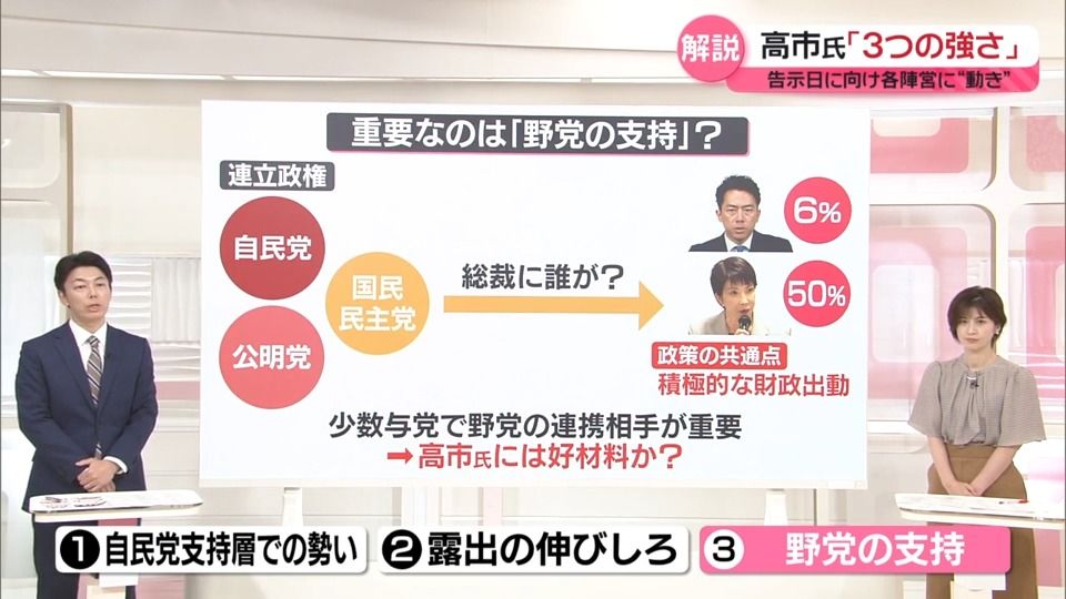 まず、高市氏の3つの強みを紹介します。1つ目は「自民党支持層での勢い」、2つ目は「露出の伸びしろ」、3つ目は「野党の支持」です。