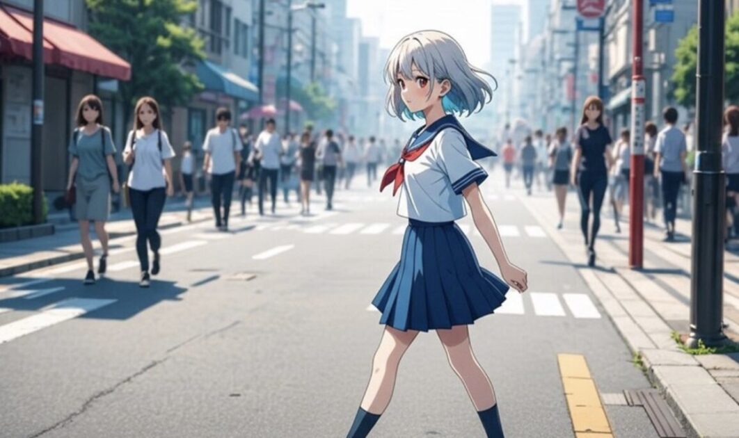 歩道を歩く人物を真横から捉えると、背景は平面的になりますが、生成AIは「画面に対して奥に続く道路」を意地でも作り上げてくる傾向があるようです。