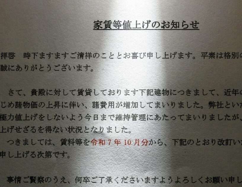 4月、各戸に「管理会社変更のお知らせ」が届いた。新たな連絡先と外国出身の担当者名が書かれていた。住民女性は、続く5月の文書に目を疑った。10月分からの「家賃等値上げのお知らせ」。驚いたのが値上げ幅で、月6万5000円が1・5倍の9万8000円、6600円の駐車場代も2・3倍の1万5000円と記されていた。負担増は計4万円超となる。